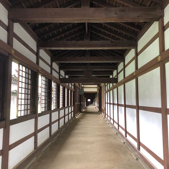 広い境内には七堂伽藍と呼ばれる七つの主要建物が整然と並び、どこを切り取っても計算された美しさがあります。 雨上がりのこの日は、青々とした芝生がしっとりと輝き、石畳や瓦屋根がその緑を映していました。