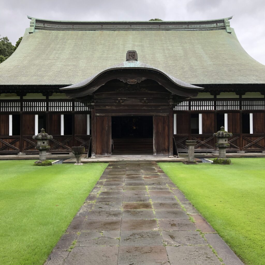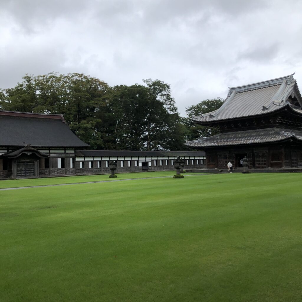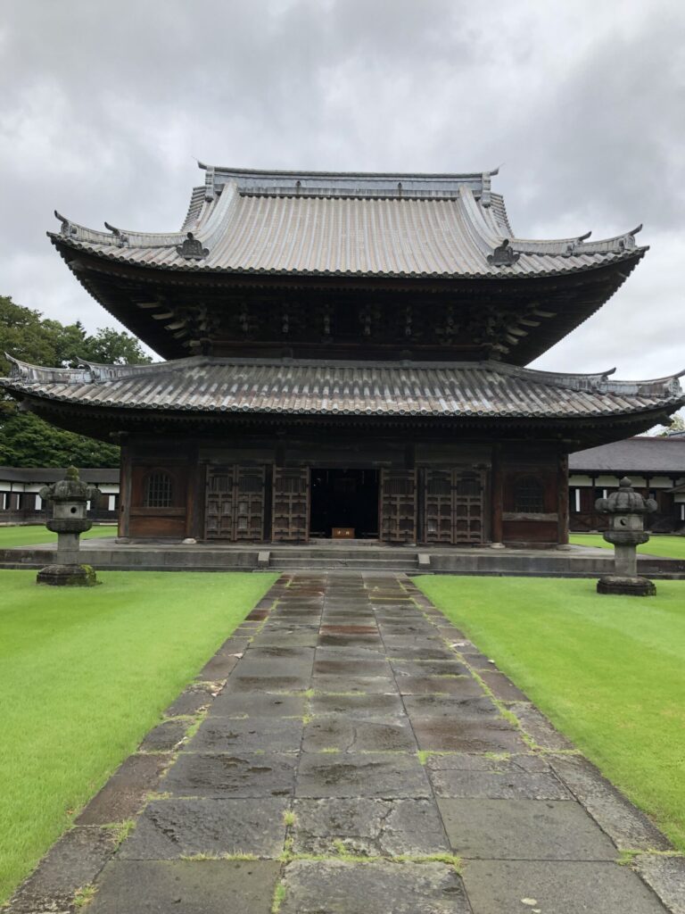 広い境内には七堂伽藍と呼ばれる七つの主要建物が整然と並び、どこを切り取っても計算された美しさがあります。雨上がりのこの日は、青々とした芝生がしっとりと輝き、石畳や瓦屋根がその緑を映していました。丁寧に手入れされた庭と堂宇のたたずまいから、加賀前田家の財力と信仰の深さが伝わってきます。